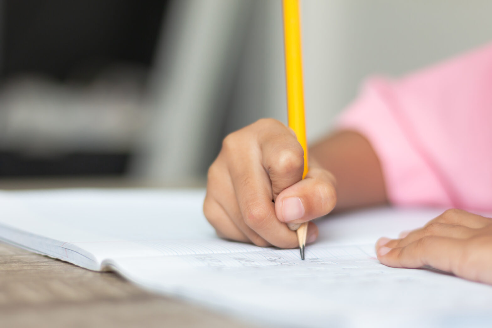 Ukázky z přijímacích testů z češtiny Close up a little girl doing homework. Hand is holding a yellow pencil and writing in a notebook. Select focus shallow depth of field and blurred background with copy space.