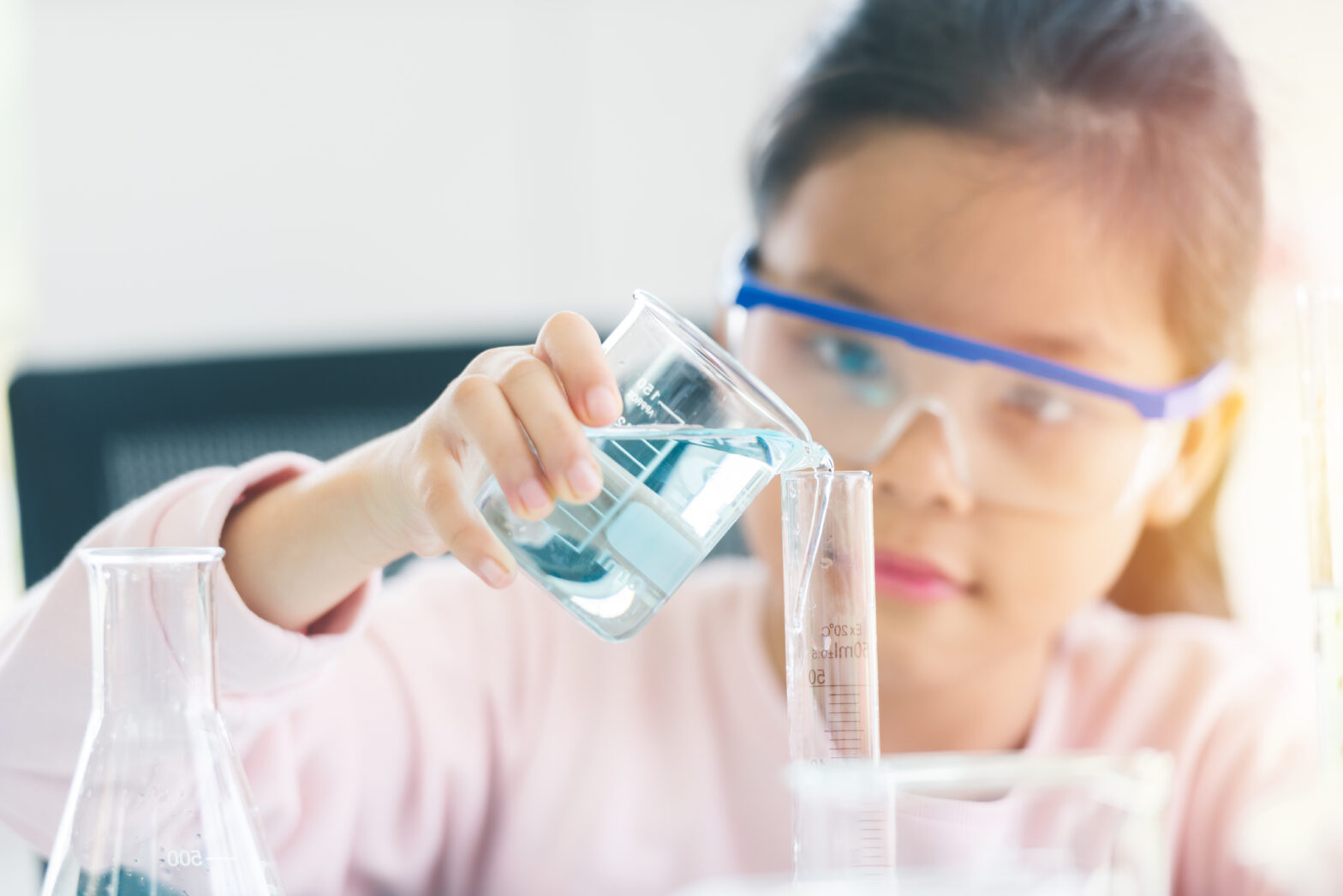 Veselá věda little asia kids girl in lab learning chemistry in school laboratory. Young scientists in protective glasses making experiment in lab or chemical cabinet. education science medical concept